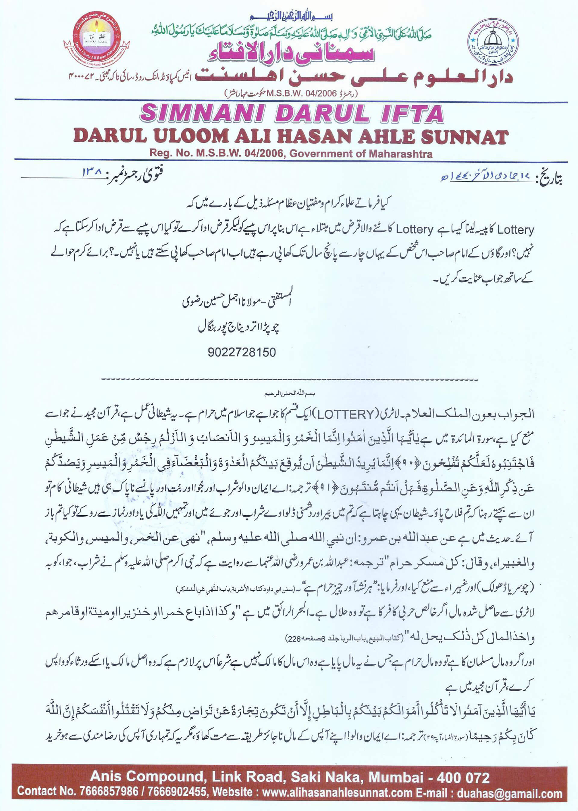لاٹری کا پیسہ لینا کیسا ہے ؟ کیا اس پیسے سے قرض ادا کیا جاسکتا ہے ؟ اور امام صاحب اس کے یہاں کھا پی سکتے ہیں یا نہیں؟