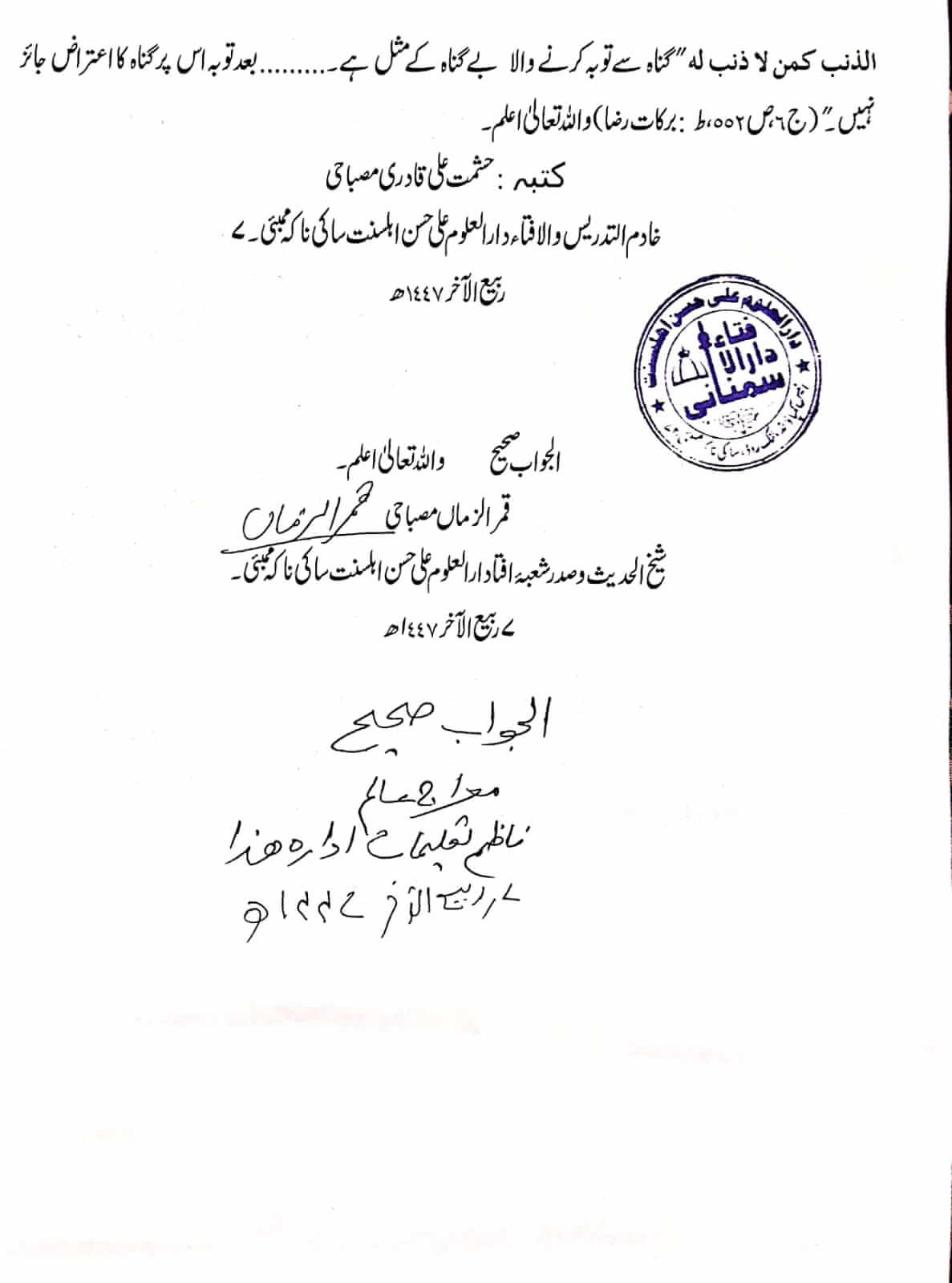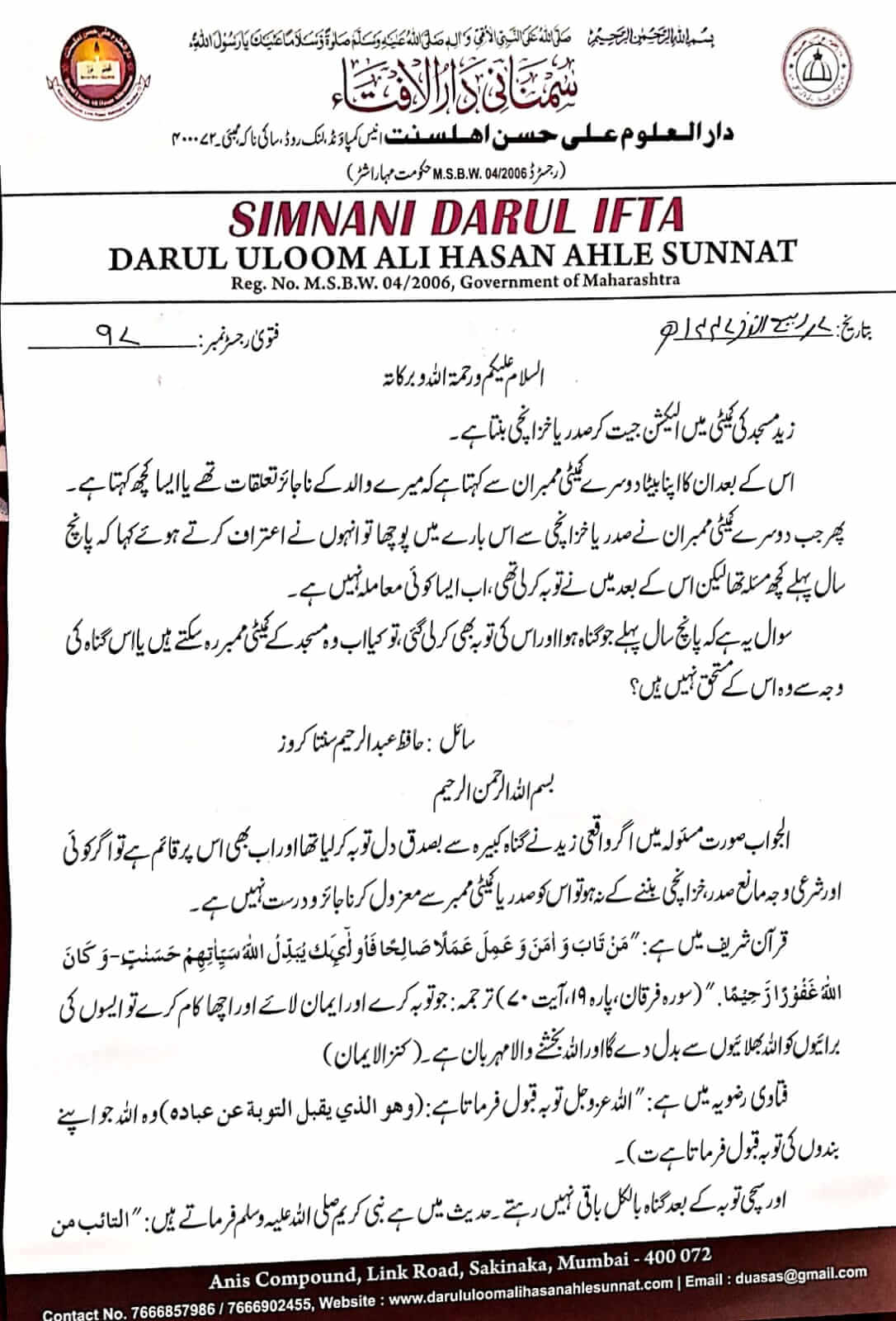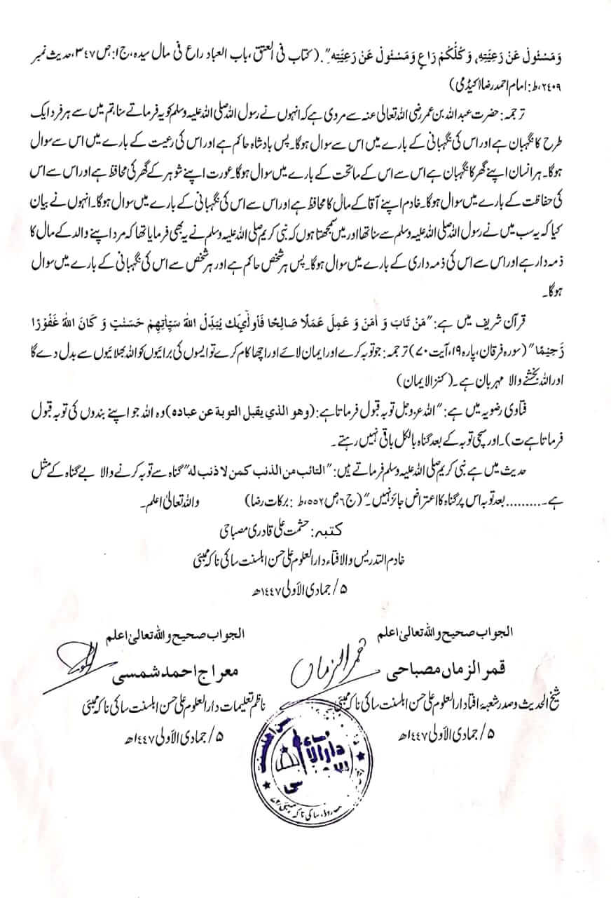 پانچ سال پہلے والے گناہ، اور اس کے توبہ کے بعد بھی کیا صدر، خزانچی کو اس کے عہدہ سے معزول کرنا درست ہے؟